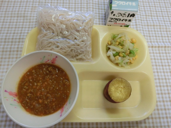 ソフトめん 牛乳 みそカレーソース さつまいもの姿揚げ 野菜サラダ