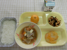 米飯 牛乳 はんぺんのもみじ揚げ 昆布豆 いなか汁 みかん