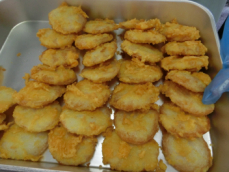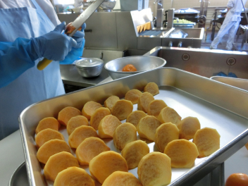 もみじ揚げとは、衣に赤や黄色の色をつけて揚げた料理です。今日の給食では、すりおろしたにんじんを衣に混ぜて色をつけ、紅葉したもみじを表現しました。季節の野菜や白身魚、鶏のささみなどでもおいしく作ることができます。春・夏・秋・冬の四季がある日本では、「和食」の中にさまざまな形で季節感が織り込まれています。今日は、はんぺんをもみじ揚げにしました。