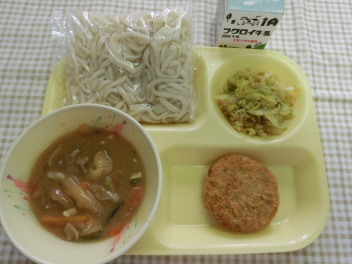 うどん 牛乳 五目みそうどん 海老芋コロッケ アーモンドあえ