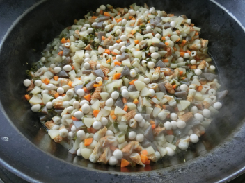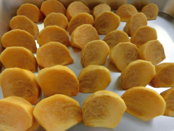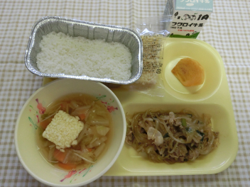 おこげスープに使用する「おこげ」には、アルファ米が使われています。アルファ米は、炊いたごはんを急速に乾燥させた食品で、これを油で揚げたものが「おこげ」です。アルファ米は水や湯を加えることで元のごはんにもどります。最近では、非常食や保存食にも利用され、登山のときの携行食としても利用されています。また、今日の果物は、秋の味覚のひとつである柿です。柿は風邪を予防するビタミンCが豊富で、まるごと1個食べると一日に必要なビタミンCがとれるといわれています。
