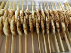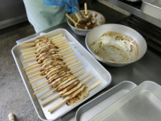 蒸しあがった五平餅に一つずつ手作りのたれをつけているところです。