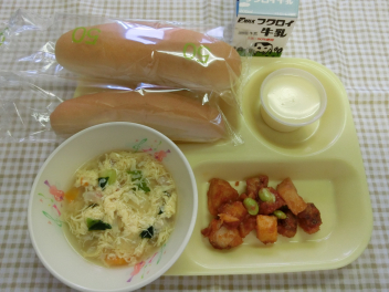 パン 牛乳 ホキのトマトソースあえ 卵スープ プリン