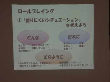 もしも、薬物使用を誘われてしまったらどうするか、についてロールプレイを行うなど、他人事だと考えず、真剣に考える良い機会となりました。