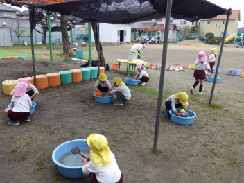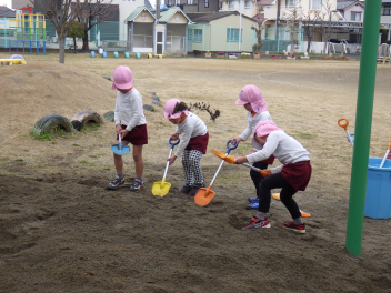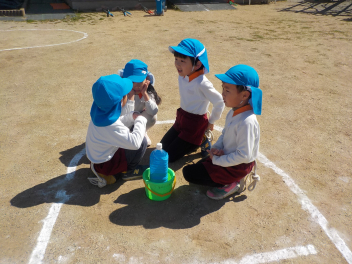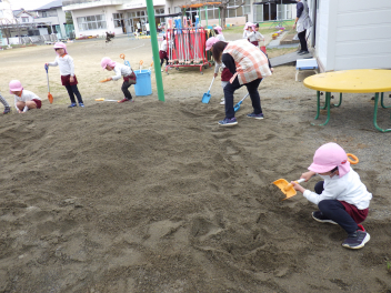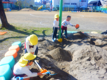 砂場遊び友達や先生と山をつくったり穴を掘ったり力を出して遊びますfrown