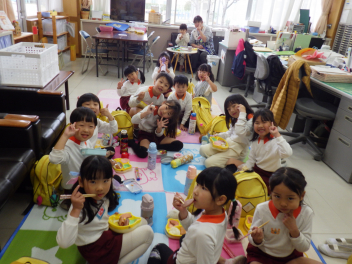 ぞう組、幼稚園最後のランチタイムは先生に部屋に集まりましたねfrown