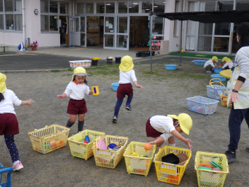 『幼稚園をきれいにして、今度来てくれる、ひよこ組が気持ちよく遊べるように片付けるぞ!』今日は外の遊び場片付けピカピカタイムです