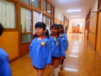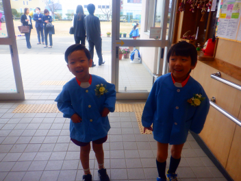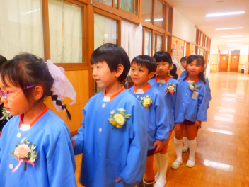 式の前にPTAのお母さんたちが用意してくださったコサージュを胸につけて準備万端です