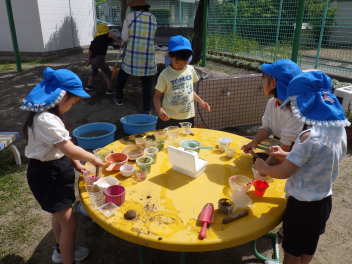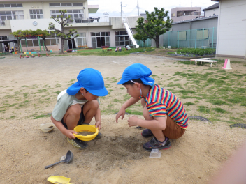 いっぱい砂を入れて、カップにお水も入れて(水飲み場かな・・プールかな・・お風呂かな・・)