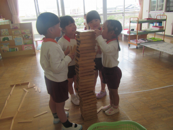 登園すると、昨日楽しかったことを始めだしたり、先生を誘ってみたり、新しい環境に触れながら思い思いに過ごす姿が見られますfrown