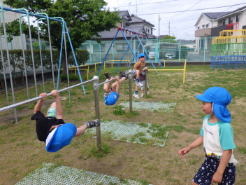 『ぞう組のこどもたち、毎日どこかで鉄棒に挑戦するね!』『手で握るところから覚えて、ぎゅって握れるようになっていってる』『友達のやっていることが刺激になって、やってみたい!!につながっているね!』