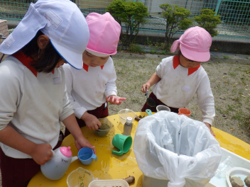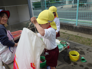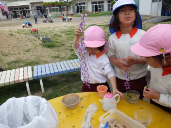 ビニール袋に花や草を入れて色水ジュースをつくっていると・・