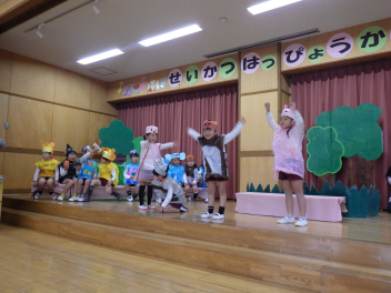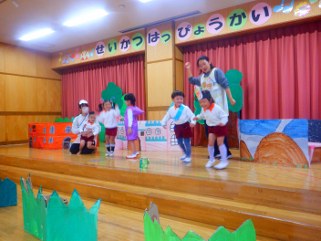 クラスでつくっている劇遊びfrown役毎に登場の歌をつくった子供たち振り付けも役のな仲間とかかん考えて見せっこしていますよfrown