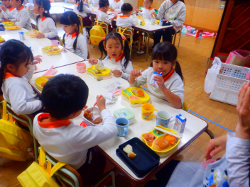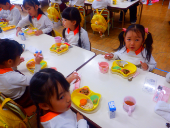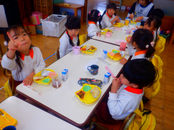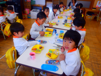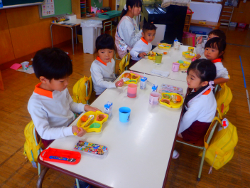 うさぎ組とひよこ組が一緒にネコちゃん弁当を食べましたsad