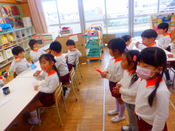 『おいしそう!!』うさぎ組に褒めてもらえて、ニッコリ笑顔のひよこ組frown