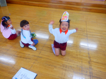 オオカミに追いかけられてたくさん走ったり、いろんなところに逃げて身体を動かしたりクラスの友達と同じ動きをすることを楽しんでいますfrown
