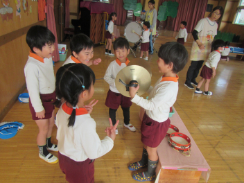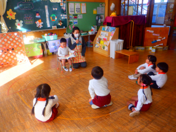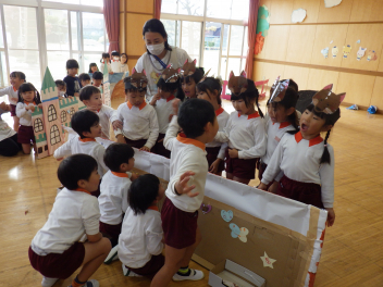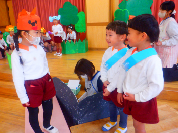 劇遊びを見てたひよこ組、しっかりおはなしのストーリーがわかっていますfrown