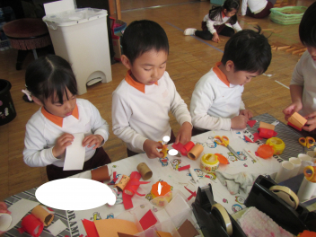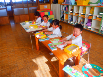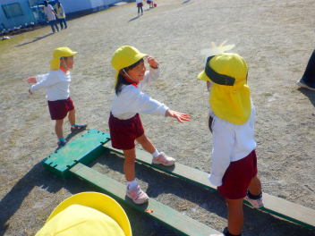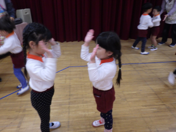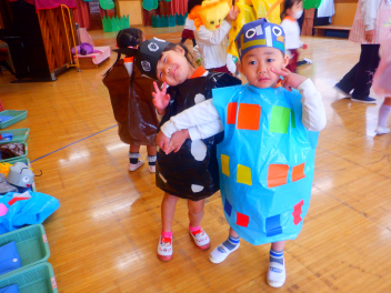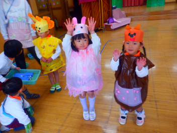 年中うさぎ組が楽しんでいる劇遊びごっこを模倣している、ひよこ組frown