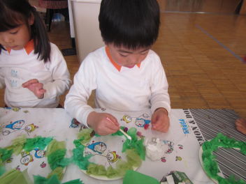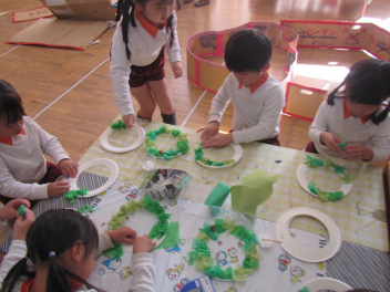 さつまのつるでつくったリースに飾る雪だるまつくり