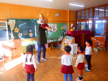 誕生会のお祝いはクリスマスの歌のブラックシアターです