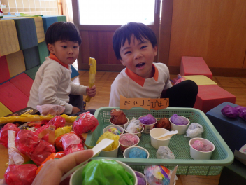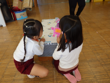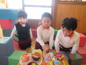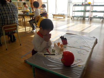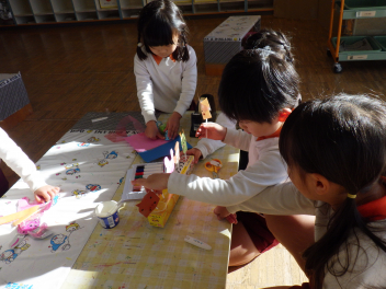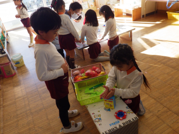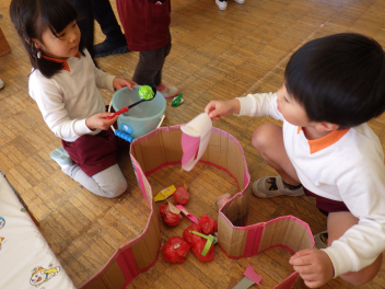 うさぎ組の劇遊びの果物を見て、ひよこ組も同じようにつくりたくなっていますよfrown