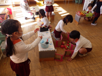 誕生会のお祝いはクリスマスの歌のブラックシアターです