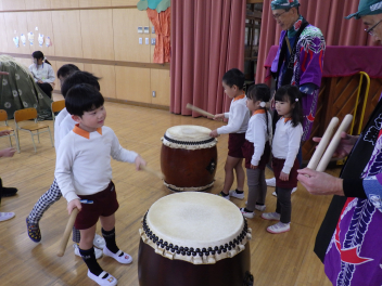 『叩いてみたい子はいますか』の声にどの子も『やりたい!!』と叩かさせてもらいましたsad