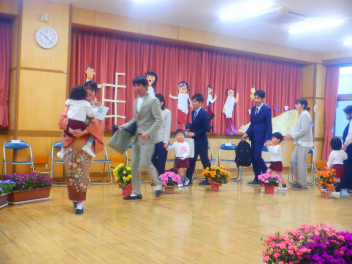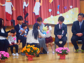 新入園児呼名では先生とうさぎちゃんやパンダ君とタッチをした子供たちですfrown