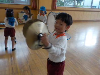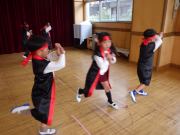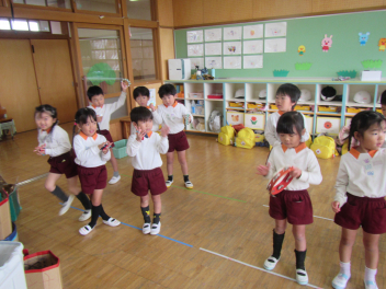 クラスでつくっている劇遊びfrown役毎に登場の歌をつくった子供たち振り付けも役のな仲間とかかん考えて見せっこしていますよfrown