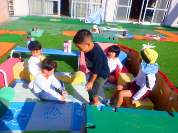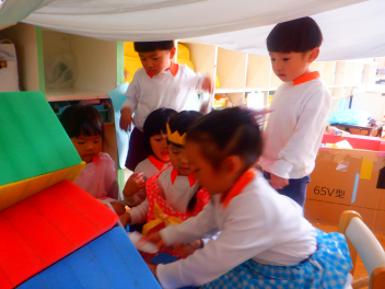 今日もさっそく先生や友達とステキな家をつくって、ネコになってみたり恐竜になってみたり