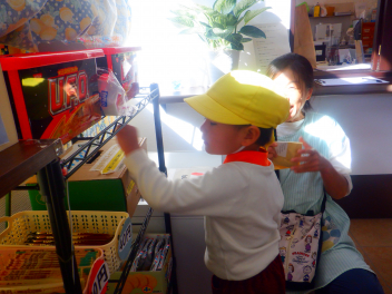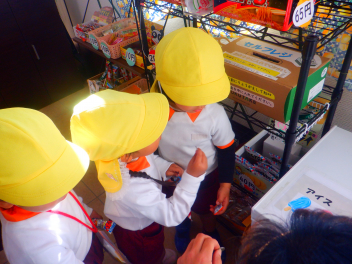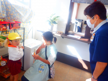 商品を選んで、代金を支払う、お土産をもらって帰るといったように、現実世界と同様、ルールに沿うことでごっこ遊びを楽しみますlaugh