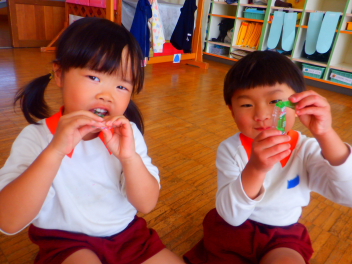 『おいしそう!!』うさぎ組に褒めてもらえて、ニッコリ笑顔のひよこ組frown