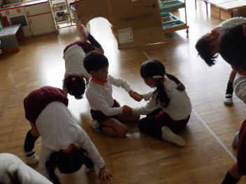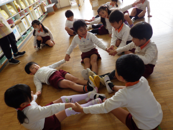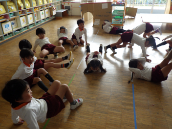 自分たちで考えて、体を曲げたり起き上がらせたりのギッコンバッタンも楽しむ子供たちですwink