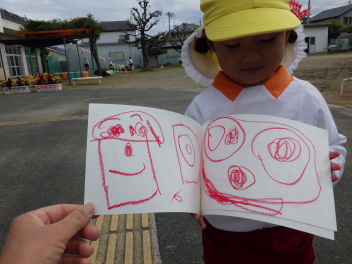 自分のかいた絵が飾れているのを見付けてニッコリfrown