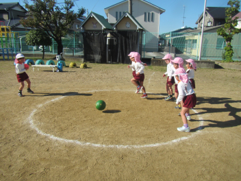 『転がしドッジやろう!』『いいよ!』『やりたい!』って集まった子供たち