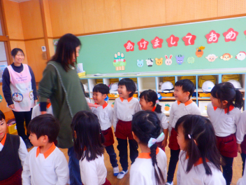 ひよこ組、うさぎ組、ぞう組の子供たちに園長から年賀状のお届けですfrown
