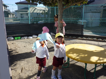 ビニール袋でつくった凧をもって園庭に意気揚々とやってきた、うさぎ組ですfrown