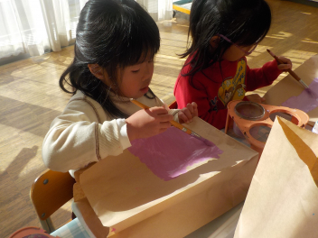 紙袋に色を塗って・・
