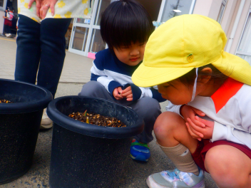 うさぎ組がひよこ組にも声をかけ、さっそくじゃがいも!にんじんつくりが始まりました