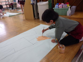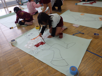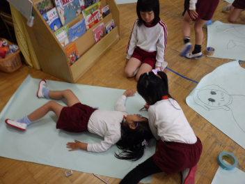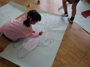 自分の型を友達にかいてもらったあと、絵の具で体の色塗りですfrown