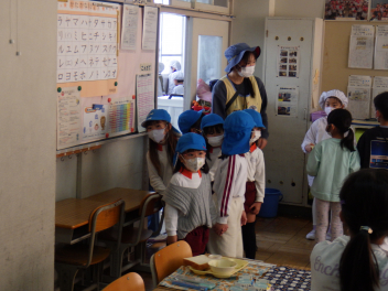 『給食当番はね、みんなの給食を配るから帽子や服を着るの』