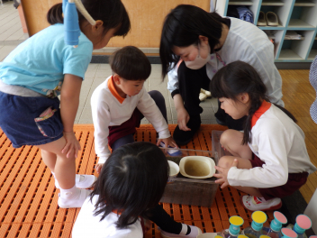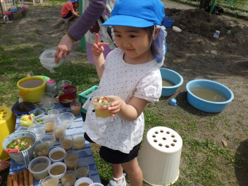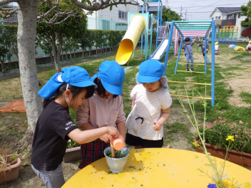水を加減したり、クローバーを摘んできたり、友達と試行錯誤してつくることを楽しんでいますfrown