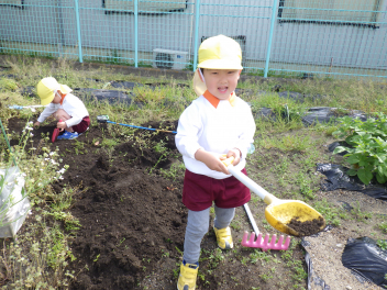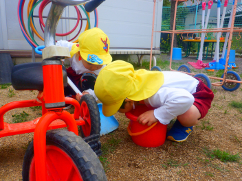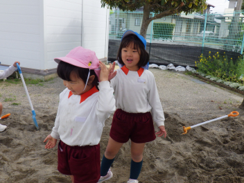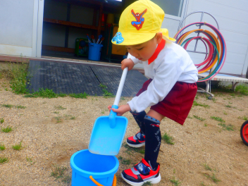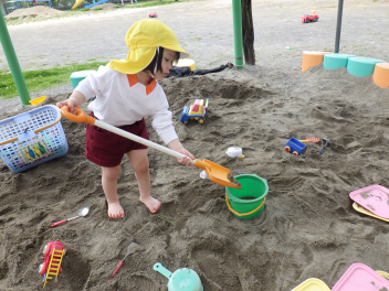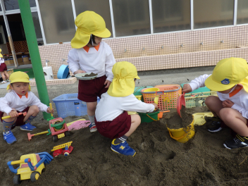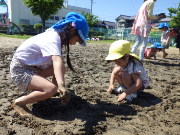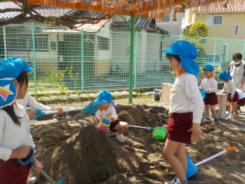 砂場遊び友達や先生と山をつくったり穴を掘ったり力を出して遊びますfrown