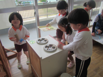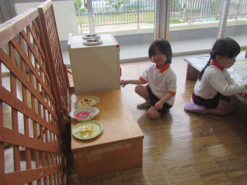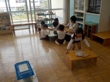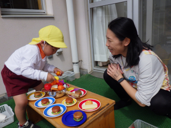 登園すると、昨日楽しかったことを始めだしたり、先生を誘ってみたり、新しい環境に触れながら思い思いに過ごす姿が見られますfrown