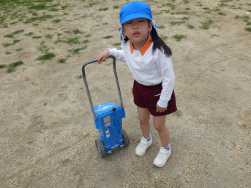 『幼稚園をきれいにして、今度来てくれる、ひよこ組が気持ちよく遊べるように片付けるぞ!』今日は外の遊び場片付けピカピカタイムです