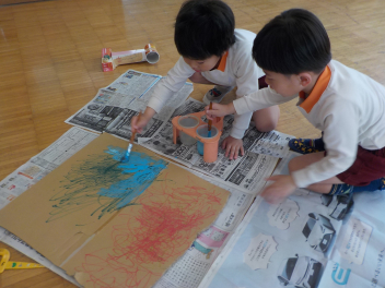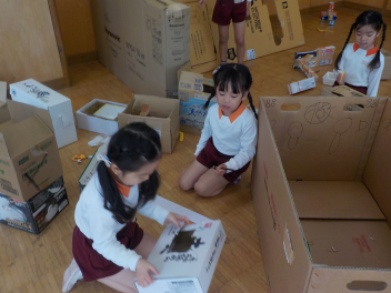 大きな大きな段ボールを段ボールカッターで切ってみたり、色を塗ってみたり