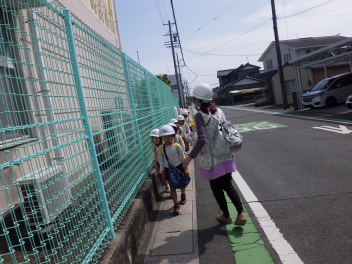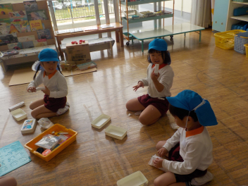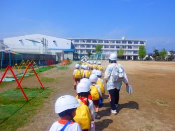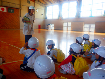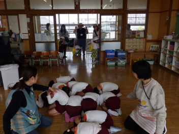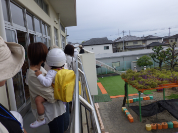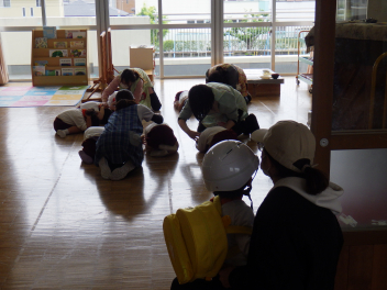 地震が来た時の避難の仕方をひよこ組のこどもたちが見る、知るための避難訓練をしました。