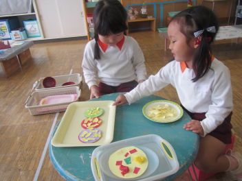 紙をちぎってチーズにしたり、丸めたりしてトッピングfrown