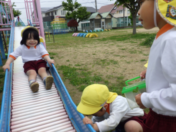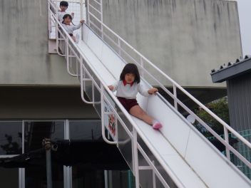2階の生活になったうさぎ組は、避難用滑り台の滑り方をぞう組の姿を見て、同じようにやってみました。