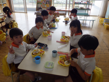 ぞう組、幼稚園最後のランチタイムは先生に部屋に集まりましたねfrown
